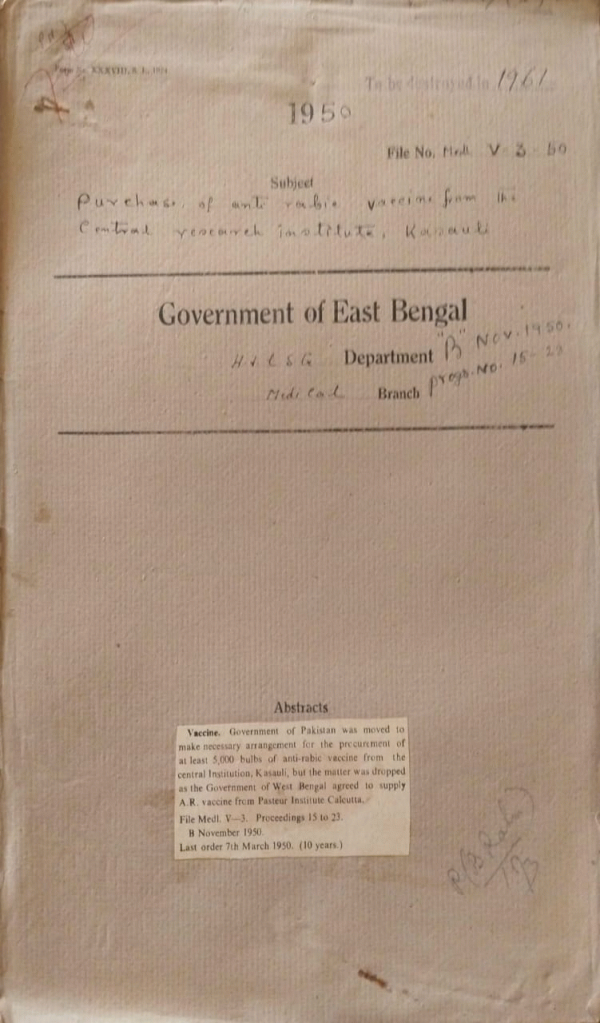 | Rack No. 09, Bundle No. 104, SI No. 8316 Sanction for payment of bills relating to last financial year lying with the central Medical Store, Tejgaon. | Rack No. 09, Bundle No. 104, SI No. 8317 Discharge of Rahim Buksh an inmate of the Hazaribugh Reformatory School. | Rack No. 09, Bundle No. 104, SI No. 8318 Remittance of funds by Pakistanis resident in Indonesia. | Rack No. 09, Bundle No. 104, SI No. 8319 Purchase of anti-rabic vaccine form the central research institute Kasauli. | Rack No. 09, Bundle No. 104, SI No. 8320 Appointment of part-time clear for Narail Sub-Dr. Prov. Hospital. | Rack No. 09, Bundle No. 104, SI No. 8321 Grant of a allowance of Rs. 10/- P.M. to Dr. T. Hossain, M.O., State Orphanage, Manamati, Comilla. | Rack No. 09, Bundle No. 104, SI No. 8322 Fixation of pay of the Contingency Medical Officers from the Hospital, Kushtia, according to the revised scale of pay. |