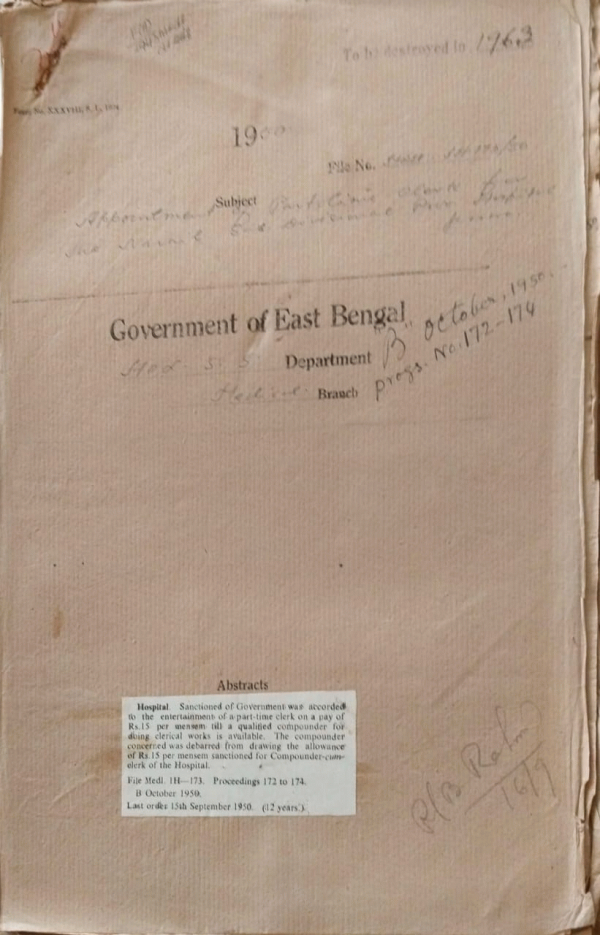 | Rack No. 09, Bundle No. 104, SI No. 8317 Discharge of Rahim Buksh an inmate of the Hazaribugh Reformatory School. | Rack No. 09, Bundle No. 104, SI No. 8318 Remittance of funds by Pakistanis resident in Indonesia. | Rack No. 09, Bundle No. 104, SI No. 8319 Purchase of anti-rabic vaccine form the central research institute Kasauli. | Rack No. 09, Bundle No. 104, SI No. 8320 Appointment of part-time clear for Narail Sub-Dr. Prov. Hospital. | Rack No. 09, Bundle No. 104, SI No. 8321 Grant of a allowance of Rs. 10/- P.M. to Dr. T. Hossain, M.O., State Orphanage, Manamati, Comilla. | Rack No. 09, Bundle No. 104, SI No. 8322 Fixation of pay of the Contingency Medical Officers from the Hospital, Kushtia, according to the revised scale of pay. | Rack No. 09, Bundle No. 104, SI No. 8323 Retention of two posts of Nursing Orderlies for Nilkhet Barracks Dispensaries for tenure of one year. |