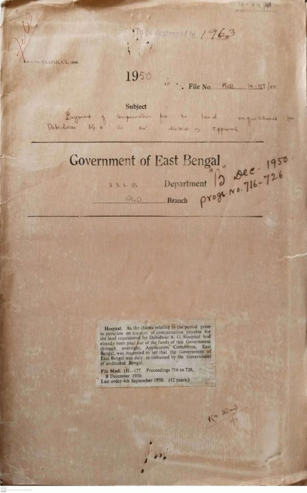 | Rack No. 09, Bundle No. 104, SI No. 8328 Plan of estimate for Rs. 2219/- for providing power supply point in the Pathology Department of the D.M.C and Hospital. | Rack No. 09, Bundle No. 104, SI No. 8329 Providing a Chimney on the gas plant room attached to D.M.C. | Rack No. 09, Bundle No. 104, SI No. 8330 Appoint of Dr. Mukhlesur Rahman for the post of R.S. in Gynecology in Jinnah Central Hospital Karachi. | Rack No. 09, Bundle No. 104, SI No. 8331 Payment of Compensation for the land requisitioned for Debidwar A.G.H. in the District of Tippera. | Rack No. 09, Bundle No. 104, SI No. 8332 Proposal to secure refund of the scholarships from the students who have migrated to West Bengal from O.M.S. | Rack No. 09, Bundle No. 104, SI No. 8333 Sanction to the investigation of the arrear Claims of Dr. P.C. Kundu. | Rack No. 09, Bundle No. 104, SI No. 8334 Registration of Foreigners arriving in Pakistan Instructions fro |