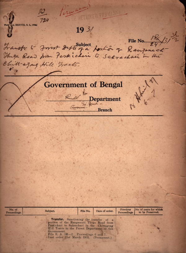 Sanctioning the transfer of a portion of the Rangamati Thega Road from Peskichari to Sakrachari in the Chittagong Hill Tracts to the Forest Department of this Government.