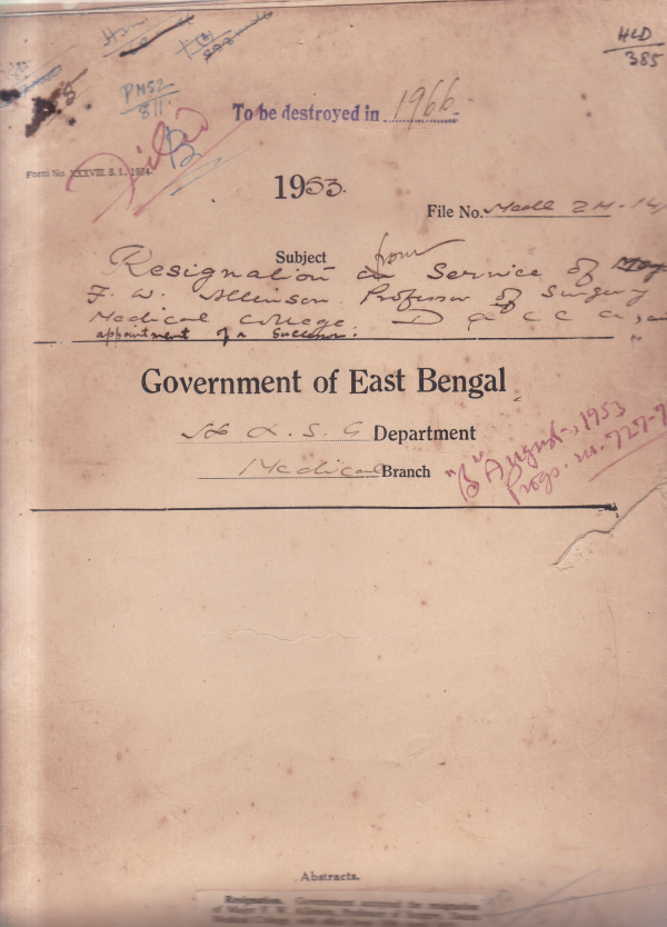 | Rack No. 10, Bundle No. 124, Sl No. 10283 Special pay of Dr. Belayet Hossain late A.S. Sadar Hospital Khulna. | Rack No. 10, Bundle No. 124, Sl No. 10284 Special pay of Dr. Syed Ahmed Hamid M.S. Rangpur for acting as C.S. Rangpur. | Rack No. 10, Bundle No. 124, Sl No. 10285 Grant of extension of leave or medical ground to Govt. Servants on leave in India. | Rack No. 10, Bundle No. 124, Sl No. 10286 Resignation of major F.W. Allinson Prof. of surgery D.M.C. | Rack No. 10, Bundle No. 124, Sl No. 10287 Maternity leave of Dr. Mrs. Hamida Malik. | Rack No. 10, Bundle No. 124, Sl No. 10288 Appointment of Dr. Maniruzzaman, S.K. Abdus Sobhan, S.K. Abdus Quamarul Huq as demonstrators of Anatomy medical college Dacca. | Rack No. 10, Bundle No. 124, Sl No. 10289 Sadar and sub-divisional hospitals Kustia concurrence of Finance Department. |