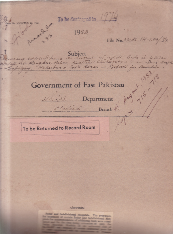 | Rack No. 10, Bundle No. 124, Sl No. 10286 Resignation of major F.W. Allinson Prof. of surgery D.M.C. | Rack No. 10, Bundle No. 124, Sl No. 10287 Maternity leave of Dr. Mrs. Hamida Malik. | Rack No. 10, Bundle No. 124, Sl No. 10288 Appointment of Dr. Maniruzzaman, S.K. Abdus Sobhan, S.K. Abdus Quamarul Huq as demonstrators of Anatomy medical college Dacca. | Rack No. 10, Bundle No. 124, Sl No. 10289 Sadar and sub-divisional hospitals Kustia concurrence of Finance Department. | Rack No. 10, Bundle No. 124, Sl No. 10290 Special pay Dr. Debabrato Chakrabarty demonstrator of anatomy Lytton medical school Mymensingh. | Rack No. 10, Bundle No. 124, Sl No. 10291 Recovery of dearness allowance by govt. employee who retire on the expiry of invalid and other pension. | Rack No. 10, Bundle No. 124, Sl No. 10292 Sanction of the advertisement charge for the requirement of nurses in D.M.C. Dacca. |