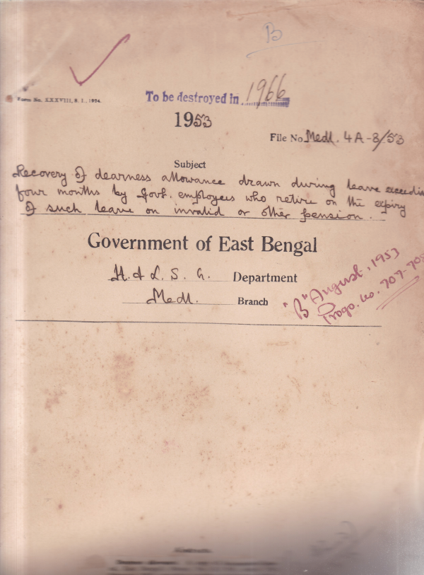 | Rack No. 10, Bundle No. 124, Sl No. 10288 Appointment of Dr. Maniruzzaman, S.K. Abdus Sobhan, S.K. Abdus Quamarul Huq as demonstrators of Anatomy medical college Dacca. | Rack No. 10, Bundle No. 124, Sl No. 10289 Sadar and sub-divisional hospitals Kustia concurrence of Finance Department. | Rack No. 10, Bundle No. 124, Sl No. 10290 Special pay Dr. Debabrato Chakrabarty demonstrator of anatomy Lytton medical school Mymensingh. | Rack No. 10, Bundle No. 124, Sl No. 10291 Recovery of dearness allowance by govt. employee who retire on the expiry of invalid and other pension. | Rack No. 10, Bundle No. 124, Sl No. 10292 Sanction of the advertisement charge for the requirement of nurses in D.M.C. Dacca. | Rack No. 10, Bundle No. 124, Sl No. 10293 Complete medical exam of prospective trainees and deputationists abroad. | Rack No. 10, Bundle No. 124, Sl No. 10294 Medical attendance and treatment at Hospital of grant of concession to Families of govt. servants. |