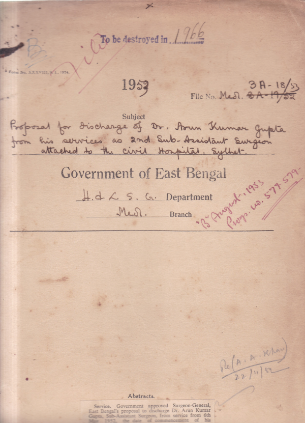 Proposal of discharge of Dr. A.K. Gupta From his service as 2nd S.A.S. attached to the civil hospital Sylhet.