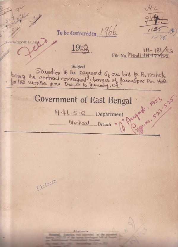 | Rack No. 10, Bundle No. 124, Sl No. 10305 Establishment of Dr. S.A. Chowdhury to Serve as the honorary visiting doctor of Red Cross Maternity and Child welfare centre. | Rack No. 10, Bundle No. 124, Sl No. 10306 Proposal of discharge of Dr. A.K. Gupta From his service as 2nd S.A.S. attached to the civil hospital Sylhet. | Rack No. 10, Bundle No. 124, Sl No. 10307 Surrender of savings under "63B department" during the year 1951-52. | Rack No. 10, Bundle No. 124, Sl No. 10308 Sanction to the payment of one bill for Rs. 122/15/6 being the central contingeal changes of Jamalpur for the months from Dec-51 to January, 52. | Rack No. 10, Bundle No. 124, Sl No. 10309 Sanction to the payment during 1952-53 bills of Rajshahi Sadar and Naogaon, Nawabganj. | Rack No. 10, Bundle No. 124, Sl No. 10310 Sanction to the payment of bills Pabna Sadar Sirajgonj Prov. Hospital. | Rack No. 10, Bundle No. 124, Sl No. 10311 Syllabus for the training of nurses midwives etc. |