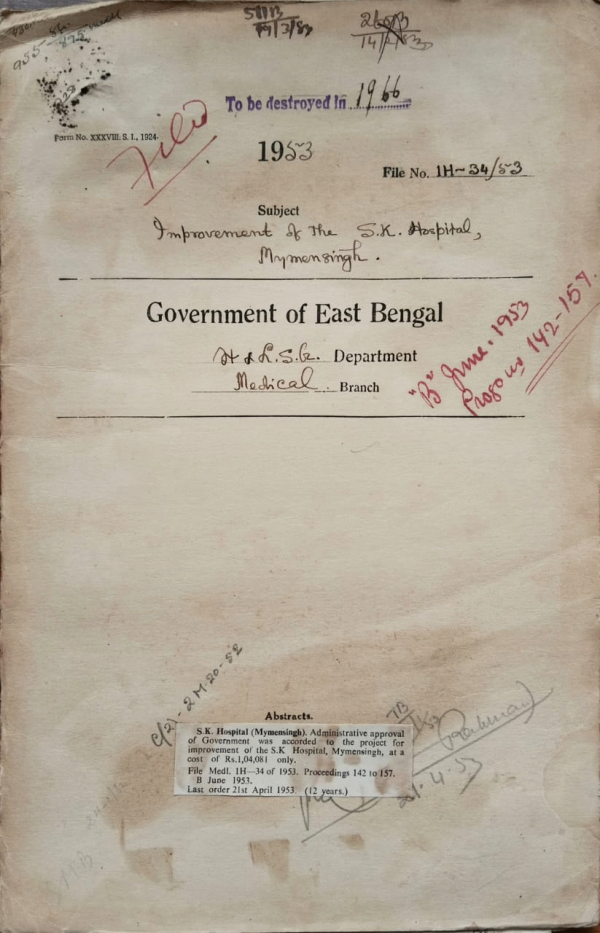 | Rack No. 10, Bundle No. 122, Sl No. 10123 Rules of the donation fees of East Bengal. | Rack No. 10, Bundle No. 122, Sl No. 10124 Repair to the T.B. Segregation Hospital at Dhalgal in the Dinajpur. | Rack No. 10, Bundle No. 122, Sl No. 10125 Additions and alteration to the X-ray department of D.M.C.H. and installation of electric lights and fans | Rack No. 10, Bundle No. 122, Sl No. 10126 Improvement of the S.K. Hospital Mymensingh. | Rack No. 10, Bundle No. 122, Sl No. 10127 Proposal for increase in died rate in all provincial Hospital. | Rack No. 10, Bundle No. 122, Sl No. 10128 Discretionary grant by H.M.C.B.D. department to Rajarampur Charitable dispensary Dianajpur. | Rack No. 10, Bundle No. 122, Sl No. 10129 Re-admission of Md. Hasir into the Dacca Medical College. |