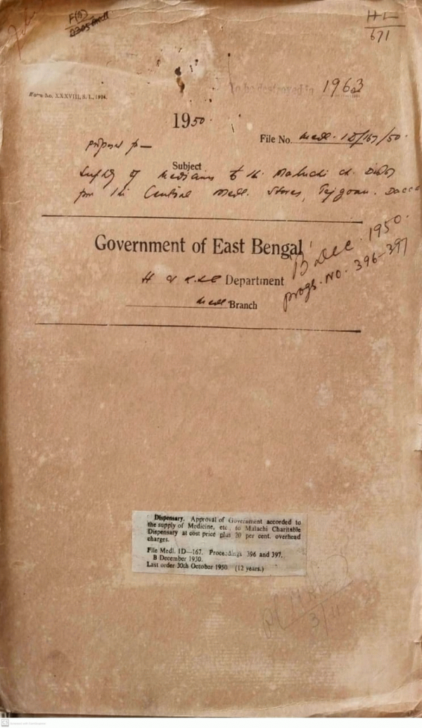 | Rack No. 09, Bundle No. 104, SI No. 8338 Verification of the leave steatement of Sri Bhupendra Nath Sil late Cashier of the Mitford Hospital. | Rack No. 09, Bundle No. 104, SI No. 8339 Repair of damaged T.B. Segregation Hospital, Mymentsingh. | Rack No. 09, Bundle No. 104, SI No. 8340 Form of certificate to be granted to compounders of the examination by state Medical Faculty. | Rack No. 09, Bundle No. 104, SI No. 8341 Proposal for supply of Medicine to the Malachi Ch. Dispensary from the central Medical Store Tejgoan, Dacca. | Rack No. 09, Bundle No. 104, SI No. 8342 Special repairs to the electrical installation and providing additional lights and fans in the Sadar Hospital at Pabna and in the Sub-divisional Hospital, Serajganj. | Rack No. 09, Bundle No. 104, SI No. 8343 Entertainment of a Sick attendant for refugee patients. | Rack No. 09, Bundle No. 104, SI No. 8344 Compensation of requiting house for civil surgeon Kushtia and his office purposes. |