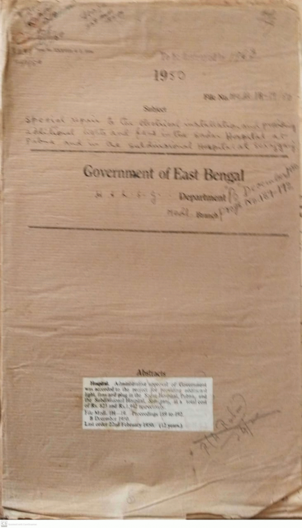 | Rack No. 09, Bundle No. 104, SI No. 8339 Repair of damaged T.B. Segregation Hospital, Mymentsingh. | Rack No. 09, Bundle No. 104, SI No. 8340 Form of certificate to be granted to compounders of the examination by state Medical Faculty. | Rack No. 09, Bundle No. 104, SI No. 8341 Proposal for supply of Medicine to the Malachi Ch. Dispensary from the central Medical Store Tejgoan, Dacca. | Rack No. 09, Bundle No. 104, SI No. 8342 Special repairs to the electrical installation and providing additional lights and fans in the Sadar Hospital at Pabna and in the Sub-divisional Hospital, Serajganj. | Rack No. 09, Bundle No. 104, SI No. 8343 Entertainment of a Sick attendant for refugee patients. | Rack No. 09, Bundle No. 104, SI No. 8344 Compensation of requiting house for civil surgeon Kushtia and his office purposes. | Rack No. 09, Bundle No. 104, SI No. 8345 Repair to storm damage staff quarters of the Noakhali Sadar Hospital during 1948-49. |