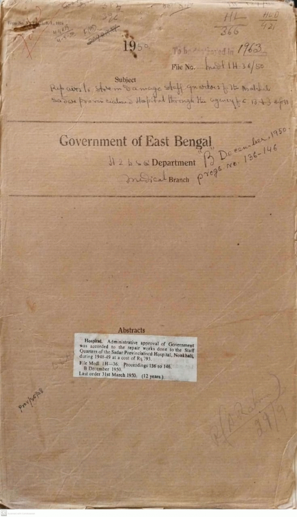 Repair to storm damage staff quarters of the Noakhali Sadar Hospital during 1948-49.