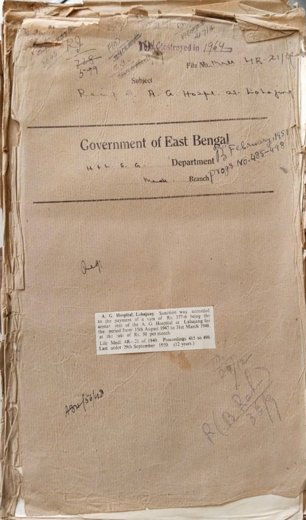 | Rack No. 09, Bundle No. 104, SI No. 8348 Maintenance of repairs to the T.B. Segregation Hospital, Nishindra, Bogra. | Rack No. 09, Bundle No. 104, SI No. 8349 Permission to Md. Akbar Hossain and V.D. Assistant Medical Directorate for publication of his book under the caption "ABAN CHHITA". | Rack No. 09, Bundle No. 104, SI No. 8350 Addition and alteration of existing internal installation in the Medical College Hospital, Dacca for converting D.C. to A.C. | Rack No. 09, Bundle No. 104, SI No. 8351 Rent of A.G. Hospital at Lahajang. | Rack No. 09, Bundle No. 104, SI No. 8352 Sanction to the Payment of Rs. 15/- being the monthly compensation for the house occupaied for the Baraigram govt. out-door Dispensary Rajshahi. | Rack No. 09, Bundle No. 104, SI No. 8353 Claims against Dr. Md. Abul Hossain Teacher of Medicine, Chittagong Medical School. | Rack No. 09, Bundle No. 104, SI No. 8354 Proposal for sanction of an additional Nursing staff Sadar Hospital (C.H.T.). |