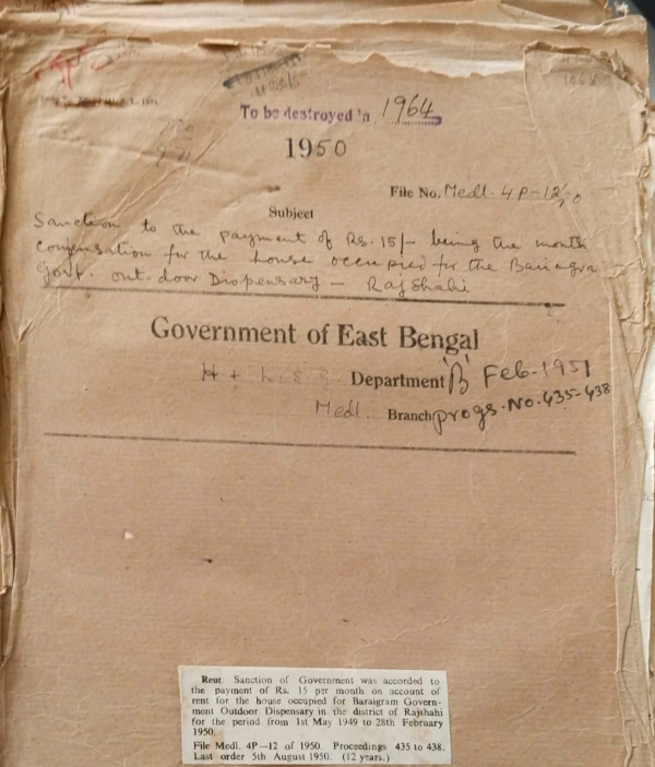 | Rack No. 09, Bundle No. 104, SI No. 8349 Permission to Md. Akbar Hossain and V.D. Assistant Medical Directorate for publication of his book under the caption "ABAN CHHITA". | Rack No. 09, Bundle No. 104, SI No. 8350 Addition and alteration of existing internal installation in the Medical College Hospital, Dacca for converting D.C. to A.C. | Rack No. 09, Bundle No. 104, SI No. 8351 Rent of A.G. Hospital at Lahajang. | Rack No. 09, Bundle No. 104, SI No. 8352 Sanction to the Payment of Rs. 15/- being the monthly compensation for the house occupaied for the Baraigram govt. out-door Dispensary Rajshahi. | Rack No. 09, Bundle No. 104, SI No. 8353 Claims against Dr. Md. Abul Hossain Teacher of Medicine, Chittagong Medical School. | Rack No. 09, Bundle No. 104, SI No. 8354 Proposal for sanction of an additional Nursing staff Sadar Hospital (C.H.T.). | Rack No. 09, Bundle No. 104, SI No. 8355 Supply of streptomycin for refugee patients at Jessore. |