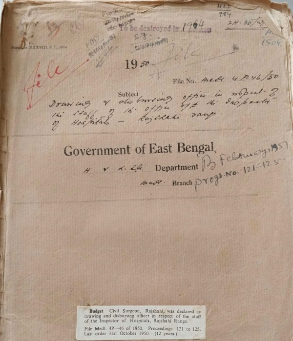 | Rack No. 09, Bundle No. 104, SI No. 8367 Requirement of stores form the U.K. During the year 1951-52. | Rack No. 09, Bundle No. 104, SI No. 8368 Collection of statistical date for long range research work. | Rack No. 09, Bundle No. 104, SI No. 8369 Sanction to the payment of Rs. 75/2/- increased for the contingent expenditure of the chagalnaiya 4 bedded emergencies Hospital, Feni Subdivision (Naokhali). | Rack No. 09, Bundle No. 104, SI No. 8370 Drawing and disbursing officer in respect of the staff of the Inspector of Hospital, Rajshahi Range. | Rack No. 09, Bundle No. 104, SI No. 8371 Permission to Md. Ilias and Miss. Hauda Hanum students of D.M.S.to enjoy the scholarship and the stipend award to them as a special case. | Rack No. 09, Bundle No. 104, SI No. 8372 Mode of passage admissible to the overseas scholars. | Rack No. 09, Bundle No. 104, SI No. 8373 Inspection Report of H.E. the governor of E.B. about Raja P.N. Roy Hospital, Rajshahi. |