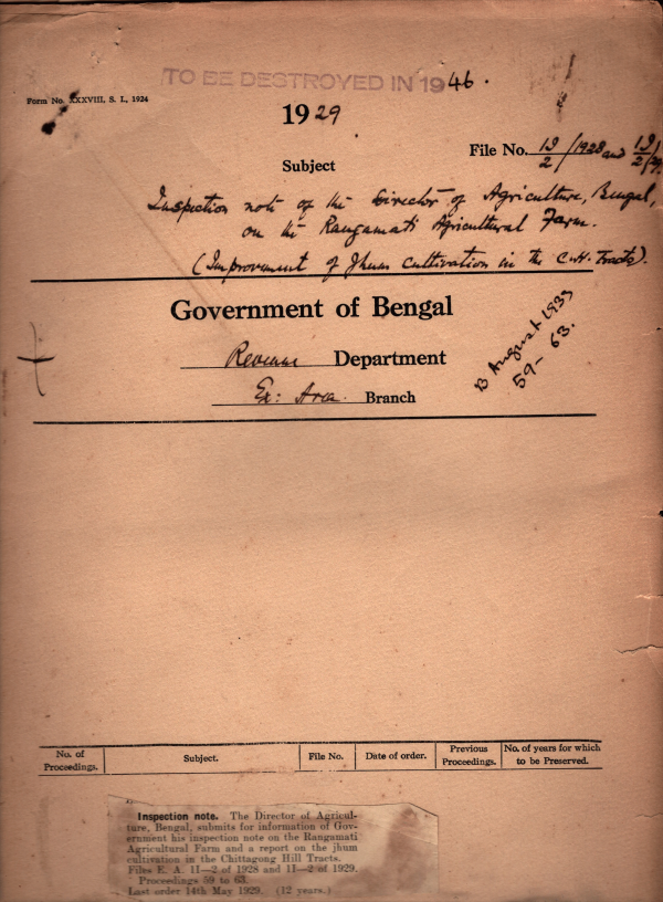 The Director of Agriculture, Bengal Submits for information of Government his inspection note on the Rangamati Agricultural Form and a report on the Jhum Cultivation n the Chittagong Hill Tracts.