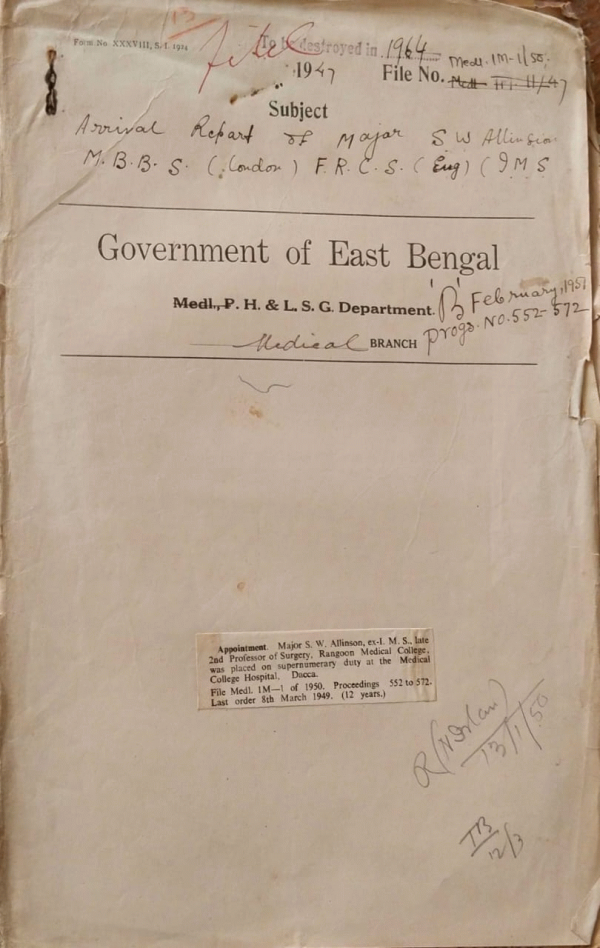 | Rack No. 09, Bundle No. 104, SI No. 8372 Mode of passage admissible to the overseas scholars. | Rack No. 09, Bundle No. 104, SI No. 8373 Inspection Report of H.E. the governor of E.B. about Raja P.N. Roy Hospital, Rajshahi. | Rack No. 09, Bundle No. 104, SI No. 8374 Supply of medicines instrument & appliances to port Hajj Office, Chittagong. | Rack No. 09, Bundle No. 104, SI No. 8375 Arrival Report of Major S.W. Allinson, M.B.B.S. (London). F.R.C.S. (Eng.) I.M.S. | Rack No. 09, Bundle No. 104, SI No. 8376 Claims against individual Bengal in respect f gratuity bill of Dr. A. N. Md. Abdur Rouf. | Rack No. 09, Bundle No. 104, SI No. 8377 Sanction to an expenditure of Rs. 2250/- only for the purchase of finned milk for D.M.C.H. from M/S. Hanif Ltd. | Rack No. 09, Bundle No. 104, SI No. 8378 Disposal of articles of the female hostel of the D.M.S. which are declared by the condemnation Board. |