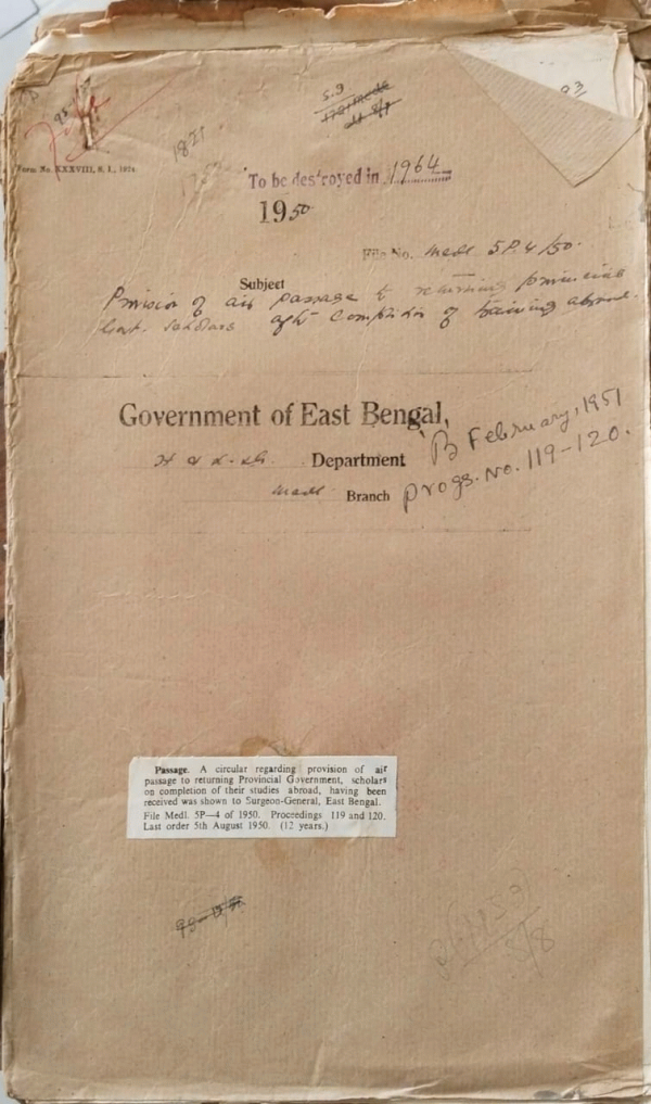 | Rack No. 09, Bundle No. 104, SI No. 8377 Sanction to an expenditure of Rs. 2250/- only for the purchase of finned milk for D.M.C.H. from M/S. Hanif Ltd. | Rack No. 09, Bundle No. 104, SI No. 8378 Disposal of articles of the female hostel of the D.M.S. which are declared by the condemnation Board. | Rack No. 09, Bundle No. 104, SI No. 8379 Providing wooden cycle stand and fixing old iron railings in ground floor Verandan of North Block attached to D.M.C.H. | Rack No. 09, Bundle No. 104, SI No. 8380 Provision of air passage to returning provincial Govt. Scholars after completion of training abroad. | Rack No. 09, Bundle No. 104, SI No. 8381 UN Social affair services fellowship in Blind Welfare. | Rack No. 09, Bundle No. 104, SI No. 8382 Grant of free studentship to the student of Govt. Tibbiya College, Sylhet. | Rack No. 09, Bundle No. 104, SI No. 8383 Supply of 2Lbs Paraldehyde to the Department of Chemistry, D.U. from the Central Medical Stores, Tejgaon, Govt. approval for the cast. |