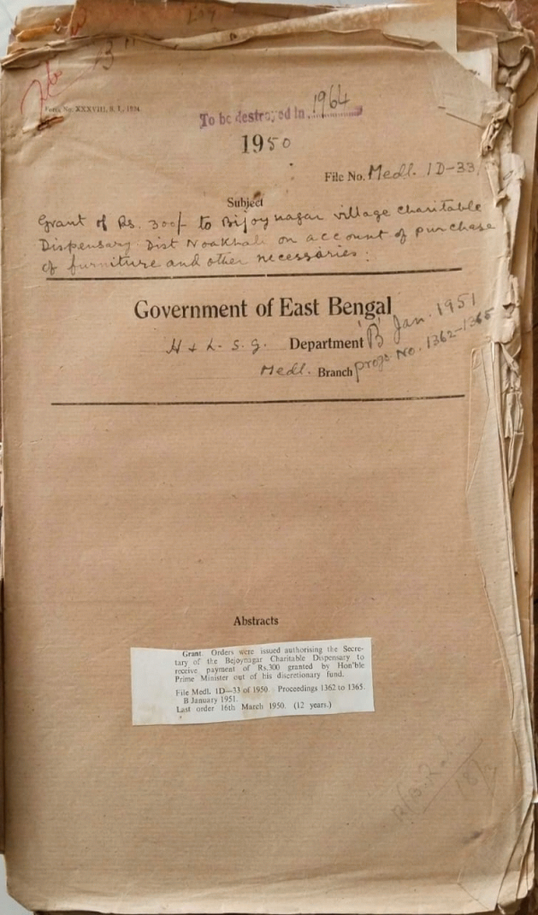 | Rack No. 09, Bundle No. 104, SI No. 8383 Supply of 2Lbs Paraldehyde to the Department of Chemistry, D.U. from the Central Medical Stores, Tejgaon, Govt. approval for the cast. | Rack No. 09, Bundle No. 104, SI No. 8384 Theft in Aminbazar Govt. out-doors Dispensary, Dacca. | Rack No. 09, Bundle No. 104, SI No. 8385 Appoint of Diet Contractors for Rajbari Provincial zed and T.B Segregation Hospital, Faridpur. | Rack No. 09, Bundle No. 104, SI No. 8386 Grant of Rs. 300/- to Bijoynagar Village Charitable Dispensary, Noakhali on account of Purchase of furniture and other necessaries. | Rack No. 09, Bundle No. 104, SI No. 8387 Proposal for starting a hospital at Hajiganj, Comilla. | Rack No. 09, Bundle No. 104, SI No. 8388 Creation of the post of Lady Superintendent of Nursing in East Bengal. | Rack No. 09, Bundle No. 104, SI No. 8389 Sanciton to the arrear bill of Babu Protap Chandra Ghose for Supplying dietary articles to the Natore Provincial zed Hospital during the period for 15-8-47 to 7-11-47. |