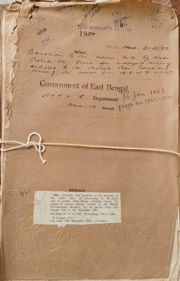 | Rack No. 09, Bundle No. 104, SI No. 8386 Grant of Rs. 300/- to Bijoynagar Village Charitable Dispensary, Noakhali on account of Purchase of furniture and other necessaries. | Rack No. 09, Bundle No. 104, SI No. 8387 Proposal for starting a hospital at Hajiganj, Comilla. | Rack No. 09, Bundle No. 104, SI No. 8388 Creation of the post of Lady Superintendent of Nursing in East Bengal. | Rack No. 09, Bundle No. 104, SI No. 8389 Sanciton to the arrear bill of Babu Protap Chandra Ghose for Supplying dietary articles to the Natore Provincial zed Hospital during the period for 15-8-47 to 7-11-47. | Rack No. 09, Bundle No. 104, SI No. 8390 Release of Pakistan Nationals from Burma Army Payment of their dues by the Govt. of Burma. | Rack No. 09, Bundle No. 104, SI No. 8391 T.A. bill of Dr. A. Ahad, teacher of Medical Jurisprudnce, D.M.S. Govt. Sanction of | Rack No. 09, Bundle No. 104, SI No. 8392 Establishment of a Serological Lab. in the D.M.C.H. |