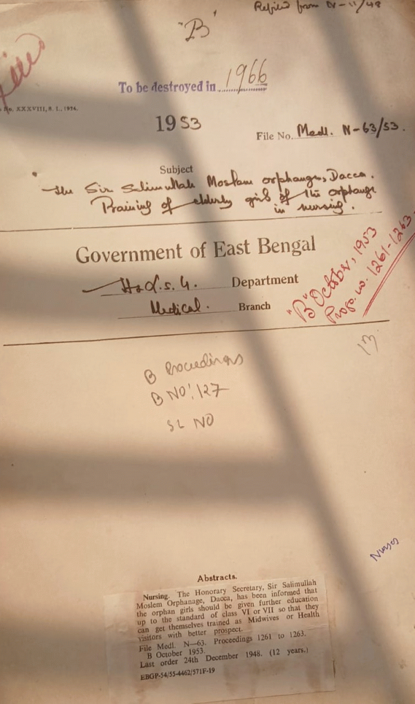 | Rack No. 10, Bundle No. 127 Sl No. 10510 Storm damage repair to the T.B.S. Hospital at Feni, Noakhali District. | Rack No. 10, Bundle No. 127 Sl No. 10511 Higher Medical Training Abroad Dr. Nural Islam. | Rack No. 10, Bundle No. 127 Sl No. 10512 Sanction of stipends to the Midwifery Training class in the Mitford Hospital, Dacca. | Rack No. 10, Bundle No. 127 Sl No. 10513 The Sir Salimullah Moslem orphanage Dacca Training of elderly girls in nursing. | Rack No. 10, Bundle No. 127 Sl No. 10514 Posting of certain A/S. to different posts. | Rack No. 10, Bundle No. 127 Sl No. 10515 Installation of Electric pump Motor in the C/S's residence at Chittagong. | Rack No. 10, Bundle No. 127 Sl No. 10516 Installation of different types of Epidiascopes and light apparatus of 110 voltages and providing separate Sub-meter in the Path, Department and Theatrical Hall of the Medical School & Hospital, Sylhet. |