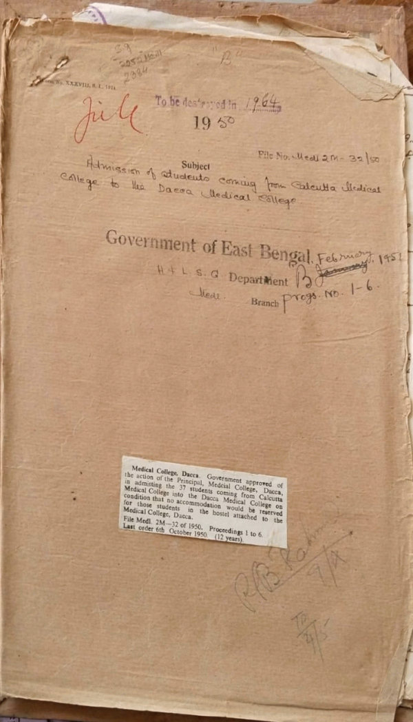 | Rack No. 09, Bundle No. 104, SI No. 8397 Reimbursement of cot of passage to Lt. Col. E.G. Montgomery, Surgeon Generla with the Govt. of E.B. | Rack No. 09, Bundle No. 104, SI No. 8398 Reservation of seats for admission in the D.M.C. from Frontier Province. | Rack No. 09, Bundle No. 104, SI No. 8399 Construction of a Shed for storage of Coal in the Compound of the Medical College Dacca. | Rack No. 09, Bundle No. 104, SI No. 8400 Admission of Student coming from Calcutta Medical Colleges to Dacca Medical College. | Rack No. 09, Bundle No. 105, SI No. 8401 Donation of Rs. 38000/- A.R.C.S. towards the training of Nurses employed in F.R.E. Hospital. | Rack No. 09, Bundle No. 105, SI No. 8402 Construction of light 3rd story over's the main building of Mitford Hospital for accommodation of 56 T.B. Hospital. | Rack No. 09, Bundle No. 105, SI No. 8403 Grant of exchange facilities Dr. Md. Lutfar Rahman Selected for Anti-T.B. training in the U.K. |