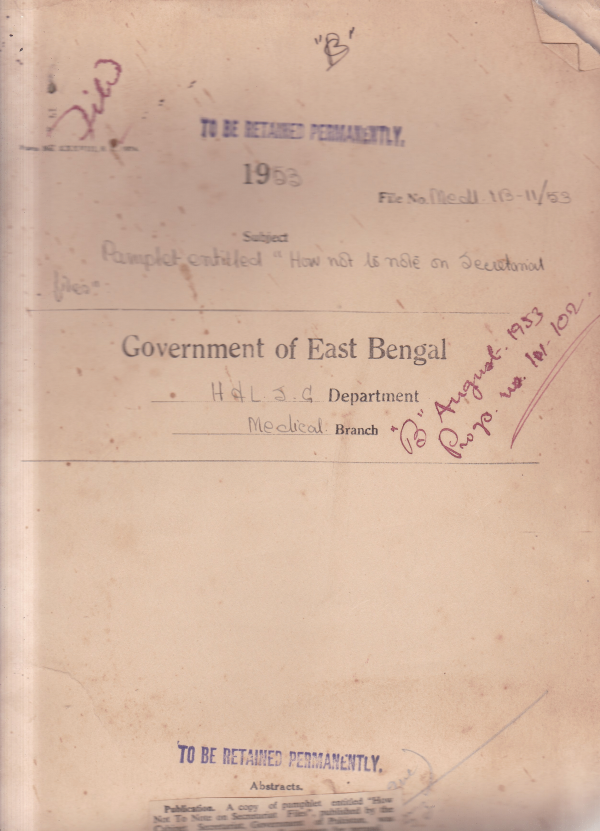| Rack No. 10, Bundle No. 123, Sl No. 10195 Spl. pay to Dr. Md. M. Rahman, teacher of surgeon, Sylhet Medical School for doing the duties of the teacher of Midwifery in additional to his own. | Rack No. 10, Bundle No. 123, Sl No. 10196 Fixation of pay of the compounders attached to the Sadar and Sub-Divisional Hospital, E.B. | Rack No. 10, Bundle No. 123, Sl No. 10197 A.Q. by Mr. Haran Ch. Burman, M.L.A. regarding number of beds. in each ward both in D.M.C. and Mitford Hospital, Dacca. | Rack No. 10, Bundle No. 123, Sl No. 10198 Pamphlet. Entitled "how not to note on Secretarial Files". | Rack No. 10, Bundle No. 123, Sl No. 10199 Advance from General Provident Account to Mr. K. F. Rahman, P.A. (Stores) to S.G., E.B. | Rack No. 10, Bundle No. 123, Sl No. 10200 Tenure of posting of Demonstrators in the Dacca Medical College. | Rack No. 10, Bundle No. 123, Sl No. 10201 Observance of financial rules by the heads of Department. |