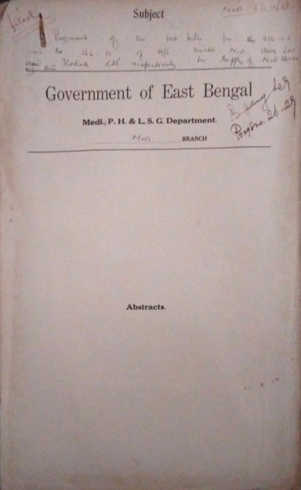 | Rack No. 09, Bundle No. 105, SI No. 8417 Submission of list of new major works for inclusion in the P.C.W. Budget for 1949-50. | Rack No. 09, Bundle No. 105, SI No. 8418 Payment of the arrear bills of 2 telephone truck call charge. | Rack No. 09, Bundle No. 105, SI No. 8419 Additional pay to Dr. Afsar, S.A.S. Habiganj Dispensary, Sylhet. | Rack No. 09, Bundle No. 105, SI No. 8420 Sanction for making payment in the year 1948 for supplies made in 1947-48. | Rack No. 09, Bundle No. 105, SI No. 8421 Payment arrear T.A. of the Compounder of the Mugura Sub-division provincialised Hospital. | Rack No. 09, Bundle No. 105, SI No. 8422 Claims against undivided Bengal in respect of Purchase of stores for F.R.E. Hospital. | Rack No. 09, Bundle No. 105, SI No. 8423 List of drawing & disbursing officers fewer than 38 medicals. |