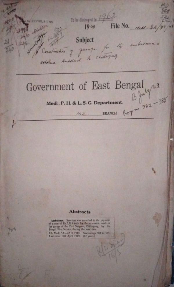 | Rack No. 09, Bundle No. 105, SI No. 8421 Payment arrear T.A. of the Compounder of the Mugura Sub-division provincialised Hospital. | Rack No. 09, Bundle No. 105, SI No. 8422 Claims against undivided Bengal in respect of Purchase of stores for F.R.E. Hospital. | Rack No. 09, Bundle No. 105, SI No. 8423 List of drawing & disbursing officers fewer than 38 medicals. | Rack No. 09, Bundle No. 105, SI No. 8424 Construction of Garage for the ambulances Supplied to Chittagong. | Rack No. 09, Bundle No. 105, SI No. 8425 Payment of arrear charges for the current financial year under the head Development Program, Dacca. | Rack No. 09, Bundle No. 105, SI No. 8426 Creation of two scholarships for each of the 2nd, 3rd & 4th year classes in the Sylhet Tibbia College. | Rack No. 09, Bundle No. 105, SI No. 8427 Payment of rent in connection with opening an Eye Stall at the Exhibition held in the old govt. House, Dacca. |