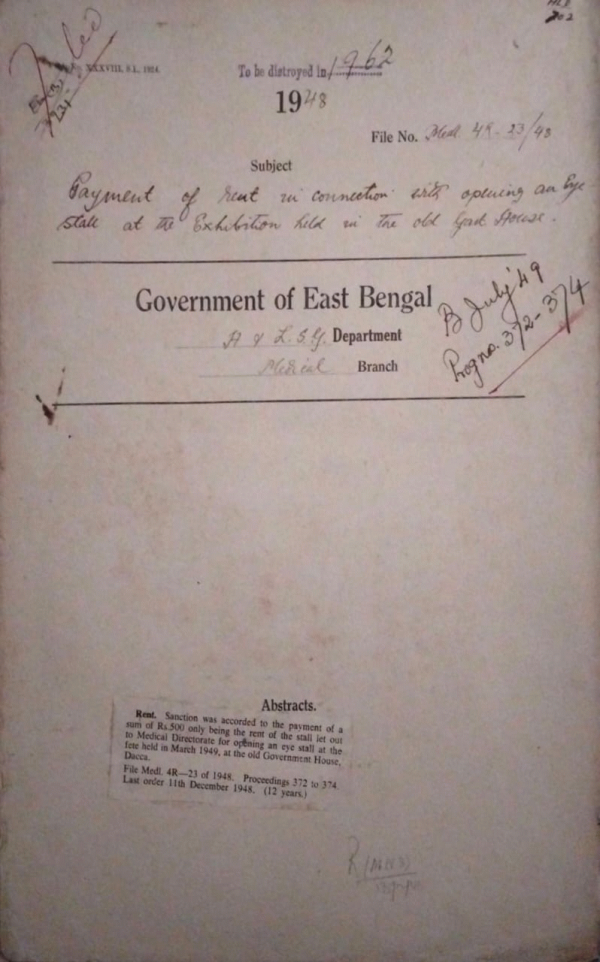 | Rack No. 09, Bundle No. 105, SI No. 8424 Construction of Garage for the ambulances Supplied to Chittagong. | Rack No. 09, Bundle No. 105, SI No. 8425 Payment of arrear charges for the current financial year under the head Development Program, Dacca. | Rack No. 09, Bundle No. 105, SI No. 8426 Creation of two scholarships for each of the 2nd, 3rd & 4th year classes in the Sylhet Tibbia College. | Rack No. 09, Bundle No. 105, SI No. 8427 Payment of rent in connection with opening an Eye Stall at the Exhibition held in the old govt. House, Dacca. | Rack No. 09, Bundle No. 105, SI No. 8428 Transfer of control of dispensaries in the Chittagong Hill-Tracts from the Surgeon general with the govt. of East Bengal. | Rack No. 09, Bundle No. 105, SI No. 8429 Proposal for shifting of the Refaitpur A.G. Hospital to the new site at Kushtia. | Rack No. 09, Bundle No. 105, SI No. 8430 Compliance for payment incurred in Calcutta to Purchase packing boxes and straw in cash. |