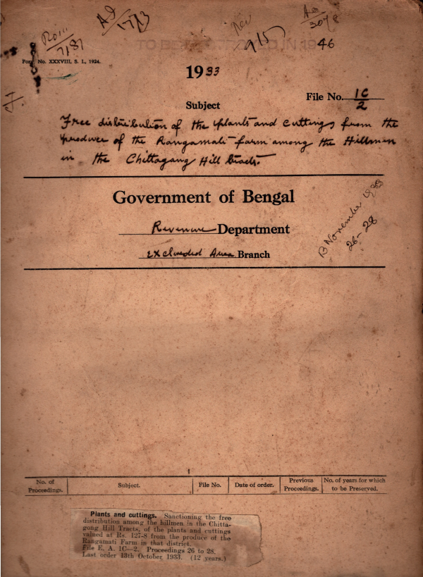 Free distribution among the Hillman in the Chittagong Hill Tracts of the Plaints and Cuttings valued at Rs. 127-8 from the product of the Rangamati farm in that district.
