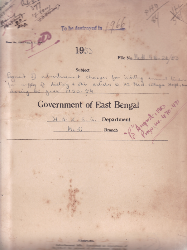 | Rack No. 10, Bundle No. 123, Sl No. 10220 Confirmation of Dr. Syed Mozzaffar Hassan in E.P.M. | Rack No. 10, Bundle No. 123, Sl No. 10221 Sanction to the payment of arrear charges under the head "Travelling Allowance" in respect of Munshiganj and Manikganj Prov. Hospital for the year. | Rack No. 10, Bundle No. 123, Sl No. 10222 Confirmation of Dr. A.K. Khan & A. Kalam in the E.P.M.S. | Rack No. 10, Bundle No. 123, Sl No. 10223 Payment of advertisement charges for calling annual tenders for supply of dietary and other articles to the D.M.C.H. | Rack No. 10, Bundle No. 123, Sl No. 10224 Payment of arrear Municipal taxes for the civil surgeon's office building, Dinajpur during the current financial year. | Rack No. 10, Bundle No. 123, Sl No. 10225 Retention of the 2nd post of Anaesthetize in the Mitford Hospital, Dacca. | Rack No. 10, Bundle No. 123, Sl No. 10226 Accommodation of four sister tutors coming from New-Zealand in the nurses block o D.M.C.H. |