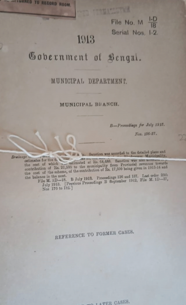 | Rack No. 12, Bundle No. 01 Sl No. 19 Proposal to form into a Separate Municipality the railway Colony at Kanchrapara which is at Present included within the Halishahar Municipality. | Rack No. 12, Bundle No. 01 Sl No. 20 Drainage Scheme Bhadreswar Municipality. | Rack No. 12, Bundle No. 01 Sl No. 21 Scheme for improving the water supply of the Darjeeling Municipality. | Rack No. 12, Bundle No. 01 Sl No. 22 Drainage Scheme, Bhadreswar Municipality. | Rack No. 12, Bundle No. 01 Sl No. 23 Reconstitution of the Halishahar Municipality. | Rack No. 12, Bundle No. 01 Sl No. 24 Improvement of Railway busti in the Asansal Municipality. | Rack No. 12, Bundle No. 01 Sl No. 25 Survey of the town of Hawrah. |
