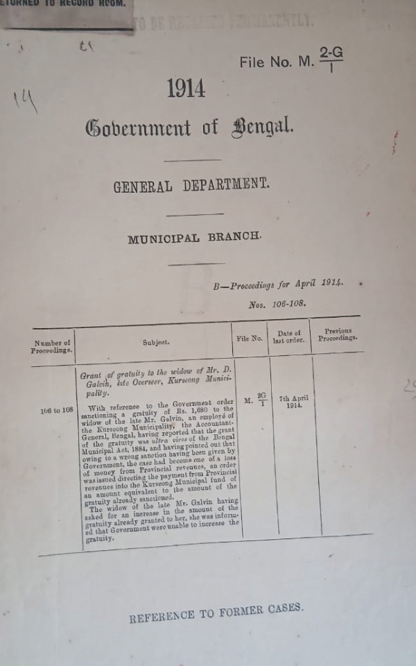 | Rack No. 12, Bundle No. 01 Sl No. 26 Moditication of Schedule VII attached the Govt. Notification regarding the extension of Certain Sections of the Calcutta Municipal Act to the Howrah Municipality. | Rack No. 12, Bundle No. 01 Sl No. 27 Election of Chairman of the Sherpur Municipality. | Rack No. 12, Bundle No. 01 Sl No. 28 L.A. Calcutta Improvement Trust. | Rack No. 12, Bundle No. 01 Sl No. 29 Grant of gratuity to the Widow of Mr. D. Galvin, late overseer, Kurseong Municipality. | Rack No. 12, Bundle No. 01 Sl No. 30 Drainage Scheme Suri Municipality. | Rack No. 12, Bundle No. 01 Sl No. 31 Agreement of the Calcutta Improvement trust with Mr. A Debais Shrosbree their Chief Valuer, for a term of Six Years. | Rack No. 12, Bundle No. 01 Sl No. 32 Howrah Municipal loan for Water Works. |