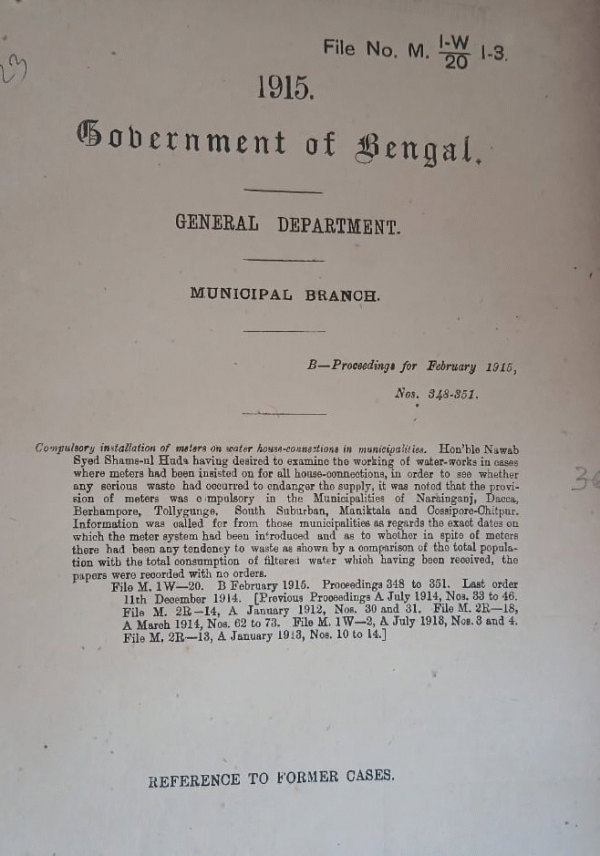 | Rack No. 12, Bundle No. 01 Sl No. 33 Rack No. 12, Bundle No. 01 Sl No. 30 | Rack No. 12, Bundle No. 01 Sl No. 34 Report and Estimate: water Supply of the Riparian Municipality on the East Bank of the river, Hooghly. | Rack No. 12, Bundle No. 01 Sl No. 35 Report of the committee appointed to consider certain technical Provisions of the Colcutta Municipal Act, 1899. | Rack No. 12, Bundle No. 01 Sl No. 36 Compulsory installation of meters on water house connections in Municipalities. | Rack No. 12, Bundle No. 01 Sl No. 37 Improvement of the Raipar Busti in the Asansol Municipality. | Rack No. 12, Bundle No. 01 Sl No. 38 Water Supply of the Riparian Municipality on the East Bank of the river Hooghly. | Rack No. 12, Bundle No. 01 Sl No. 39 Contribution from the Cosspore-Chitpur Municipal of local lying outside the Municipality. |
