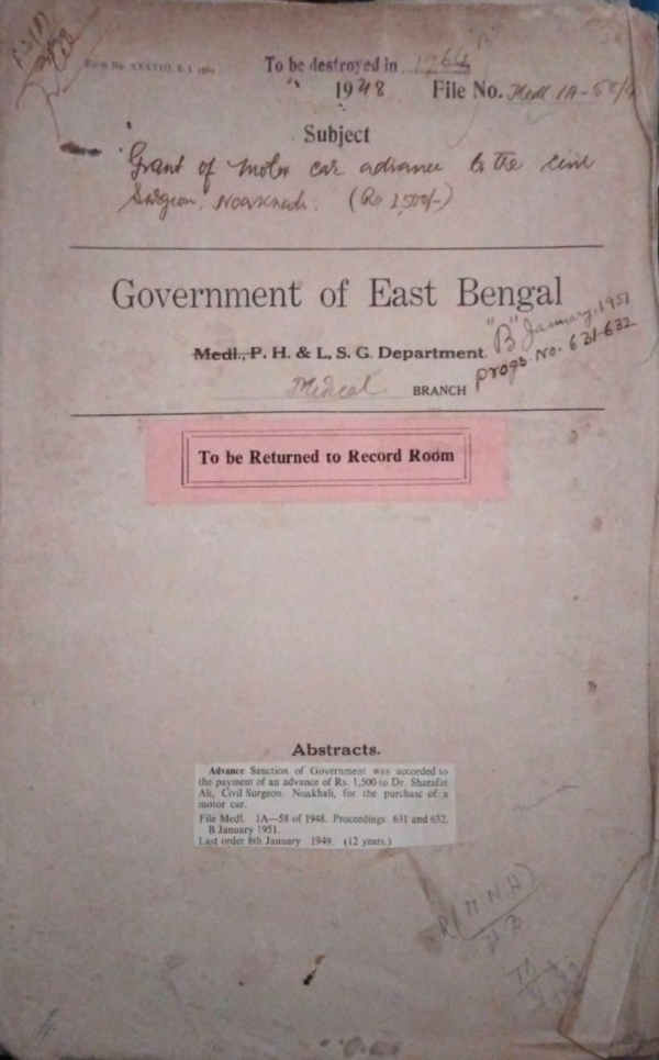 | Rack No. 09, Bundle No. 105, SI No. 8436 Recognition of Homeopathy Supply of copy etc. of Act. | Rack No. 09, Bundle No. 105, SI No. 8437 Drugs Act 1940 manufacture and sale of Drugs. | Rack No. 09, Bundle No. 105, SI No. 8438 Additional pay to S.A.S. Dr. Hafizul Rahman of Sadar Hospital, Rajshahi. | Rack No. 09, Bundle No. 105, SI No. 8439 Grant of Motor Car advance to the Civil Surgeon, Noakhali. | Rack No. 09, Bundle No. 105, SI No. 8440 Construction and repairs to A.G. and F.R.E. Hospital thought the agency of the W+B Department Dacca Division. | Rack No. 09, Bundle No. 105, SI No. 8441 Repairs to Paribagh for nurses P.T.S. | Rack No. 09, Bundle No. 105, SI No. 8442 Proposal for having a public health unit in the Kalapara P.S. in Bakarganj District. |