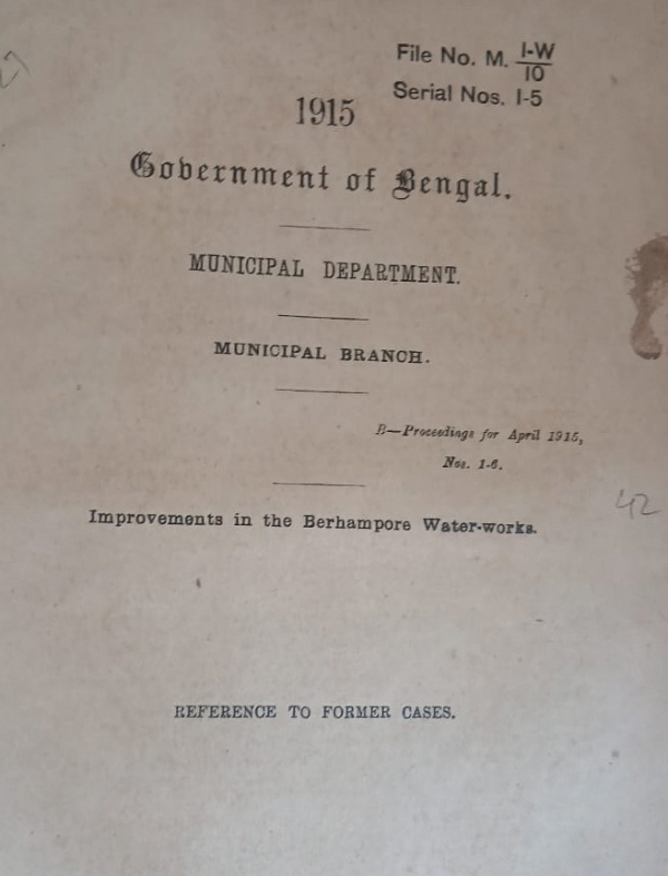 | Rack No. 12, Bundle No. 01 Sl No. 39 Contribution from the Cosspore-Chitpur Municipal of local lying outside the Municipality. | Rack No. 12, Bundle No. 01 Sl No. 40 Proposal of the Corporation of Calcutta to withhold their Contribution payable of the Calcutta improvement trust till the termination of the war. | Rack No. 12, Bundle No. 01 Sl No. 41 Improvement of the milk-supply of Calcutta. | Rack No. 12, Bundle No. 01 Sl No. 42 Improvements in the Berhampore water works. | Rack No. 12, Bundle No. 01 Sl No. 43 Imposition of Municipal taxes on the Railway buildings at Dhulian. | Rack No. 12, Bundle No. 01 Sl No. 44 Water-Supply Scheme of the Municipality on the East Bank of the river Hooghly. | Rack No. 12, Bundle No. 01 Sl No. 45 Extension of the certain Sections of the Cicutta Improvement Act to the Cossipore-Chitpur Municipality. |