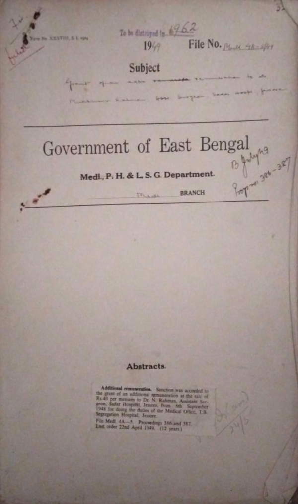 | Rack No. 09, Bundle No. 105, SI No. 8443 Admission in audit of excess expenditure incurred during 1948-49. | Rack No. 09, Bundle No. 105, SI No. 8444 Proposal for retention of the two temporary posts of non-gazetted Assistant Chemical Examiners. | Rack No. 09, Bundle No. 105, SI No. 8445 Fixation of pay of Mvi. T. Hossain P.A. & S.I. | Rack No. 09, Bundle No. 105, SI No. 8446 Grant of an extra remuneration to Dr. Mukhlesur Rahman, Assistant Surgeon, Sadar Hospital, Jessore. | Rack No. 09, Bundle No. 105, SI No. 8447 Repairs & Re-construction of A.G. Hospitals in Bakerganj. | Rack No. 09, Bundle No. 105, SI No. 8448 Payment of arrear claims of Mymensingh Municipality. | Rack No. 09, Bundle No. 105, SI No. 8449 Translation of the Bengal Medical (East Bengal) Act XIV of 1949. |
