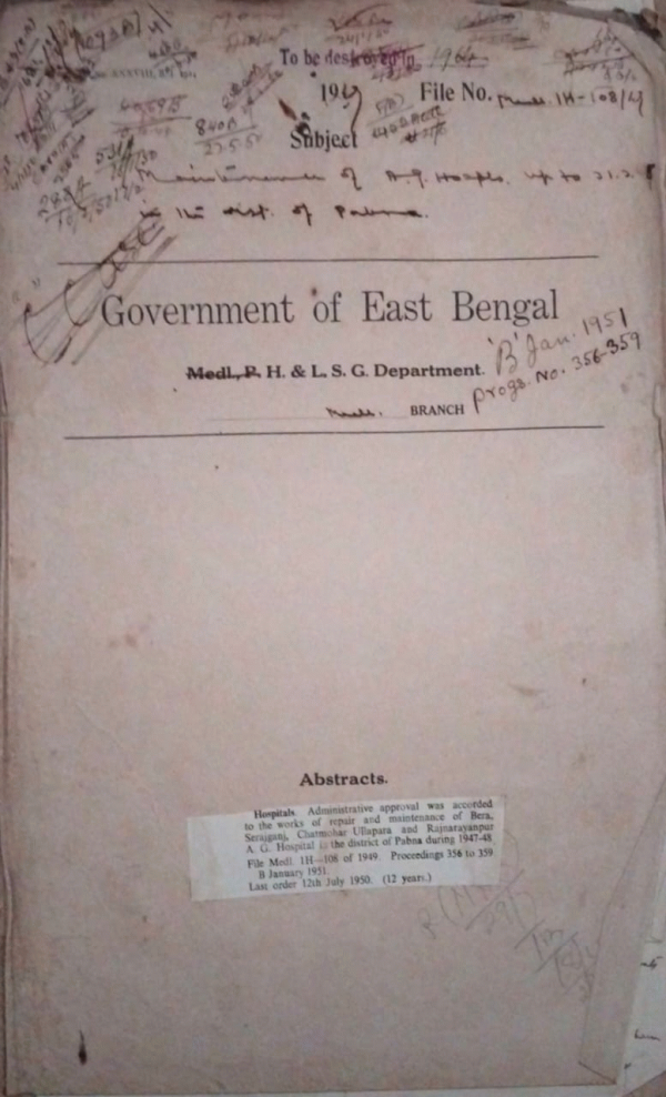 | Rack No. 09, Bundle No. 105, SI No. 8447 Repairs & Re-construction of A.G. Hospitals in Bakerganj. | Rack No. 09, Bundle No. 105, SI No. 8448 Payment of arrear claims of Mymensingh Municipality. | Rack No. 09, Bundle No. 105, SI No. 8449 Translation of the Bengal Medical (East Bengal) Act XIV of 1949. | Rack No. 09, Bundle No. 105, SI No. 8450 Maintenance of A.G. Hospitals up to 31.3.48 in the District of Pubna. | Rack No. 09, Bundle No. 105, SI No. 8451 Search and Rescue Organization for aircraft in Distress. | Rack No. 09, Bundle No. 105, SI No. 8452 All Pakistan Medical Register. | Rack No. 09, Bundle No. 105, SI No. 8453 Retention of the post of one L.D.A., one typist in the office of the Lady Superintendent of Nursing. |