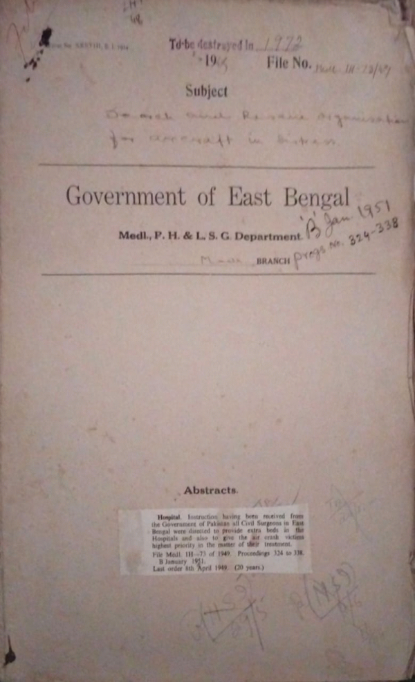 | Rack No. 09, Bundle No. 105, SI No. 8448 Payment of arrear claims of Mymensingh Municipality. | Rack No. 09, Bundle No. 105, SI No. 8449 Translation of the Bengal Medical (East Bengal) Act XIV of 1949. | Rack No. 09, Bundle No. 105, SI No. 8450 Maintenance of A.G. Hospitals up to 31.3.48 in the District of Pubna. | Rack No. 09, Bundle No. 105, SI No. 8451 Search and Rescue Organization for aircraft in Distress. | Rack No. 09, Bundle No. 105, SI No. 8452 All Pakistan Medical Register. | Rack No. 09, Bundle No. 105, SI No. 8453 Retention of the post of one L.D.A., one typist in the office of the Lady Superintendent of Nursing. | Rack No. 09, Bundle No. 105, SI No. 8454 Sanction of a post of the compounder for general Hospital, Chittagong. |