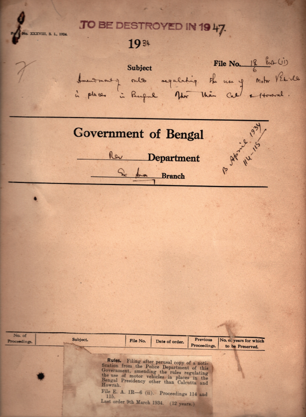 Filing after perusal copy of a notification from the Police Department of this Government, amending the rules regulating the use of motor vehicles in Places in the Bengal Presidency other than Calcutta and Howrah.