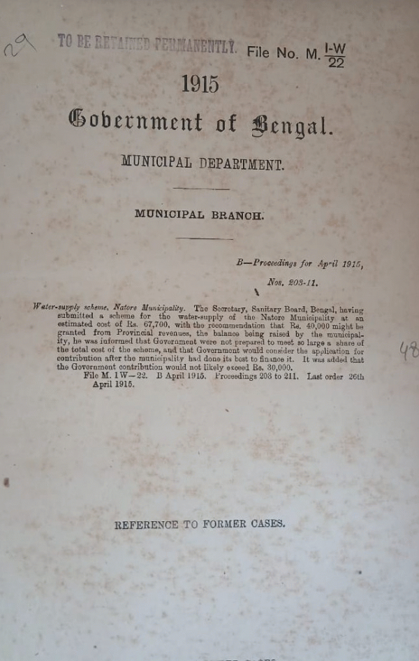 | Rack No. 12, Bundle No. 01 Sl No. 45 Extension of the certain Sections of the Cicutta Improvement Act to the Cossipore-Chitpur Municipality. | Rack No. 12, Bundle No. 01 Sl No. 46 Appointments, Assansol Municipality. | Rack No. 12, Bundle No. 01 Sl No. 47 Howrah Municipal Loan. | Rack No. 12, Bundle No. 01 Sl No. 48 Water-Supply Scheme, Natore Municipality. | Rack No. 12, Bundle No. 01 Sl No. 49 Barisal Water Works. | Rack No. 12, Bundle No. 01 Sl No. 50 Mymensingh drainage and water supply scheme. | Rack No. 12, Bundle No. 01 Sl No. 51 Garden Reach Drainage Scheme. |