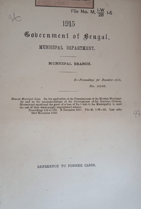 | Rack No. 12, Bundle No. 01 Sl No. 44 Water-Supply Scheme of the Municipality on the East Bank of the river Hooghly. | Rack No. 12, Bundle No. 01 Sl No. 45 Extension of the certain Sections of the Cicutta Improvement Act to the Cossipore-Chitpur Municipality. | Rack No. 12, Bundle No. 01 Sl No. 46 Appointments, Assansol Municipality. | Rack No. 12, Bundle No. 01 Sl No. 47 Howrah Municipal Loan. | Rack No. 12, Bundle No. 01 Sl No. 48 Water-Supply Scheme, Natore Municipality. | Rack No. 12, Bundle No. 01 Sl No. 49 Barisal Water Works. | Rack No. 12, Bundle No. 01 Sl No. 50 Mymensingh drainage and water supply scheme. |