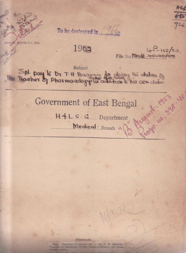| Rack No. 10, Bundle No. 123, Sl No. 10229 Retention of the post of 2nd ward master, Mitford Hospital Dacca. | Rack No. 10, Bundle No. 123, Sl No. 10230 Declaration of A.S.G. (Stores) as drawing and disbursing officer in respect of the contingent charges of the Laundray Plant, Tejgaon. | Rack No. 10, Bundle No. 123, Sl No. 10231 Training of Rural Health Inspector in Sanitary inspectorships Course. | Rack No. 10, Bundle No. 123, Sl No. 10232 Spl. pay of Dr. T.H. Basunia for doing the duties of the teacher of Pharmacology in additional to his own duties. | Rack No. 10, Bundle No. 123, Sl No. 10233 Recruitment to central services made on a local basis as against all-Pakistan. | Rack No. 10, Bundle No. 123, Sl No. 10234 Allotment for telephone rent bill for 1952-53. | Rack No. 10, Bundle No. 123, Sl No. 10235 Australian govt. scholarship for advanced studies in Nursing Medical training. |