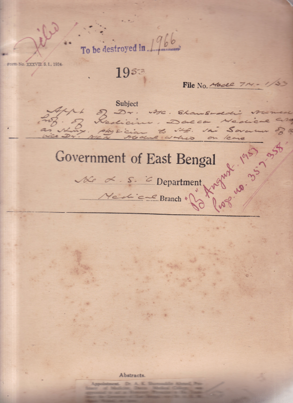 Appointment of Dr. A.K. Shamsuddin Ahmed, Prof. of Medicine, D.M.C. as Honorary Physician to H.E. the government of E.B. Vice Dr. A.K.M. Abdul wahed on leave.