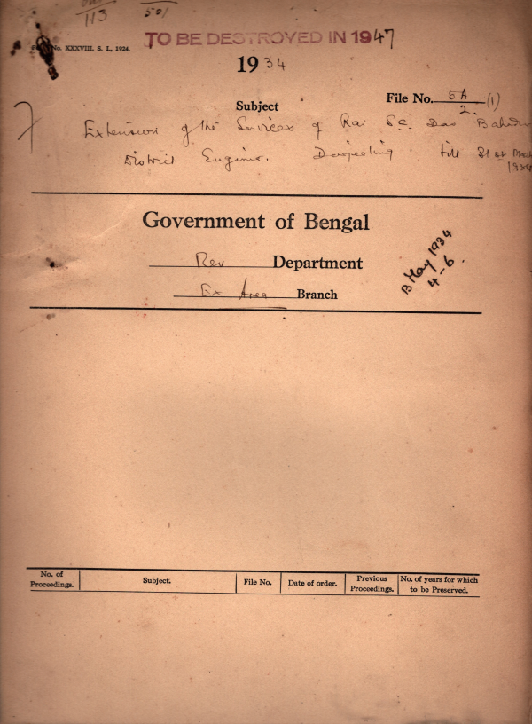 Extensor of the Services of Rai SC. Das Bahadur as District Engineer of Darjeeling Hill 31st March, 1934.