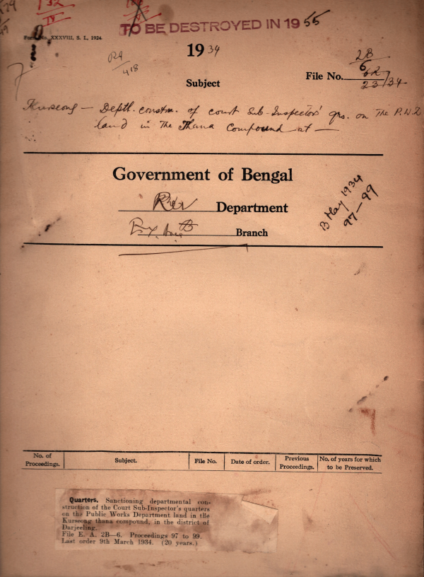 | Rack No. 37, Bundle No. 03, SI No. 192 Payment of the occupier share of Rent consequent on the Passing at the Bengal Municipal Act, 1932. | Rack No. 37, Bundle No. 03, SI No. 193 Resumption and disposal of lands. | Rack No. 37, Bundle No. 03, SI No. 194 Extensor of the Services of Rai SC. Das Bahadur as District Engineer of Darjeeling Hill 31st March, 1934. | Rack No. 37, Bundle No. 03, SI No. 195 Sanction departmental Construction of the Court Sub-Inspector's quarters on the Public Works Department land in the Kurseong thana Compound in the District of Darjeeling. | Rack No. 37, Bundle No. 03, SI No. 196 Payment of occupier Shar of rent under the new Bengal Municipal Act. | Rack No. 37, Bundle No. 03, SI No. 197 Amendments in the rules regulating the use of Motor Vehicles in Place in Bengal other Cal & Howrah. | Rack No. 37, Bundle No. 03, SI No. 198 Sanctioning the writing off the amount of Rs. 1,144-11 stolen from the office of the Market Superintendent Darjeeling Municipality. |