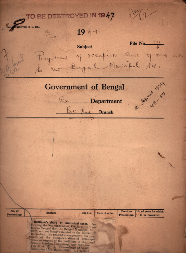 | Rack No. 37, Bundle No. 03, SI No. 193 Resumption and disposal of lands. | Rack No. 37, Bundle No. 03, SI No. 194 Extensor of the Services of Rai SC. Das Bahadur as District Engineer of Darjeeling Hill 31st March, 1934. | Rack No. 37, Bundle No. 03, SI No. 195 Sanction departmental Construction of the Court Sub-Inspector's quarters on the Public Works Department land in the Kurseong thana Compound in the District of Darjeeling. | Rack No. 37, Bundle No. 03, SI No. 196 Payment of occupier Shar of rent under the new Bengal Municipal Act. | Rack No. 37, Bundle No. 03, SI No. 197 Amendments in the rules regulating the use of Motor Vehicles in Place in Bengal other Cal & Howrah. | Rack No. 37, Bundle No. 03, SI No. 198 Sanctioning the writing off the amount of Rs. 1,144-11 stolen from the office of the Market Superintendent Darjeeling Municipality. | Rack No. 37, Bundle No. 03, SI No. 199 Construction of a connate bridge at Sevoke river. |