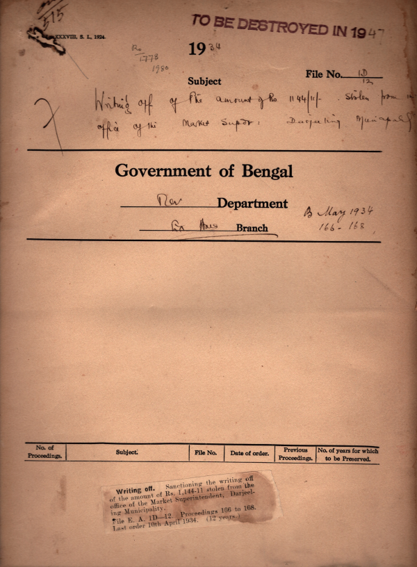 | Rack No. 37, Bundle No. 03, SI No. 195 Sanction departmental Construction of the Court Sub-Inspector's quarters on the Public Works Department land in the Kurseong thana Compound in the District of Darjeeling. | Rack No. 37, Bundle No. 03, SI No. 196 Payment of occupier Shar of rent under the new Bengal Municipal Act. | Rack No. 37, Bundle No. 03, SI No. 197 Amendments in the rules regulating the use of Motor Vehicles in Place in Bengal other Cal & Howrah. | Rack No. 37, Bundle No. 03, SI No. 198 Sanctioning the writing off the amount of Rs. 1,144-11 stolen from the office of the Market Superintendent Darjeeling Municipality. | Rack No. 37, Bundle No. 03, SI No. 199 Construction of a connate bridge at Sevoke river. | Rack No. 37, Bundle No. 03, SI No. 200 Council Resolution by Mr. A. Rahman M.H.C. regarding the arrangement of a Motor mail service between Siliguri and Darjeeling. | Rack No. 37, Bundle No. 04, SI No. 201 Report of the working of the local Audit Department for the year 1929-30. |