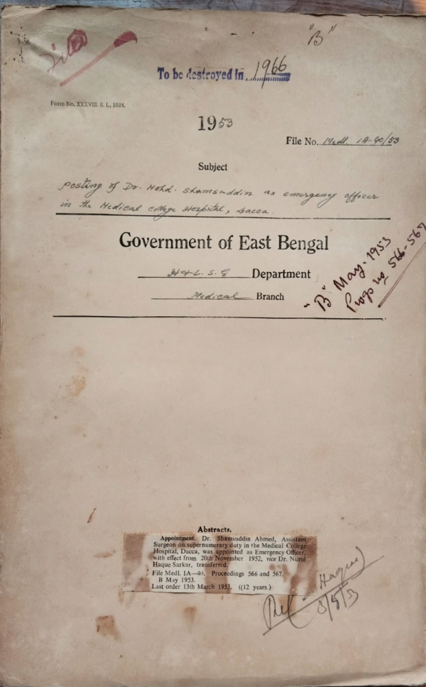 | Rack No. 10, Bundle No. 122, Sl No. 10128 Discretionary grant by H.M.C.B.D. department to Rajarampur Charitable dispensary Dianajpur. | Rack No. 10, Bundle No. 122, Sl No. 10129 Re-admission of Md. Hasir into the Dacca Medical College. | Rack No. 10, Bundle No. 122, Sl No. 10130 Improvement to the Sub-Divisional Hospital Munshignaj and Manikgonj and Manikgonj Plans and estimates of | Rack No. 10, Bundle No. 122, Sl No. 10131 Posting of Dr. Shams Uddin Ahmed as emergency officer in the medical college Hospital Dacca. | Rack No. 10, Bundle No. 122, Sl No. 10132 Permission to Dr. Zohra Khafur, Lady S.A.S. Sadar Prov. Hospital, Rajhshahi for retraining her Indian Citizenship. | Rack No. 10, Bundle No. 122, Sl No. 10133 Appointment of Miss. Karis Maula. A. Matron D.M.C. as register of the E.B. Nursing. | Rack No. 10, Bundle No. 122, Sl No. 10134 A.G. pays Mr. Ahmed Hossain M.L.A. regarding the duties of the House Surgeon of house Physician of the Dacca Medical C. Hospital. |