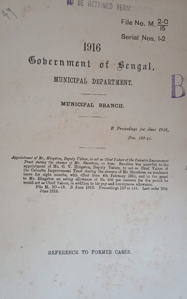 Appointment of Mr. Hingston, Deputy Valuer to act as Chief Valuer of the Calcutta Improvement trust during the absence of Mr. Shrosbree, on leave.