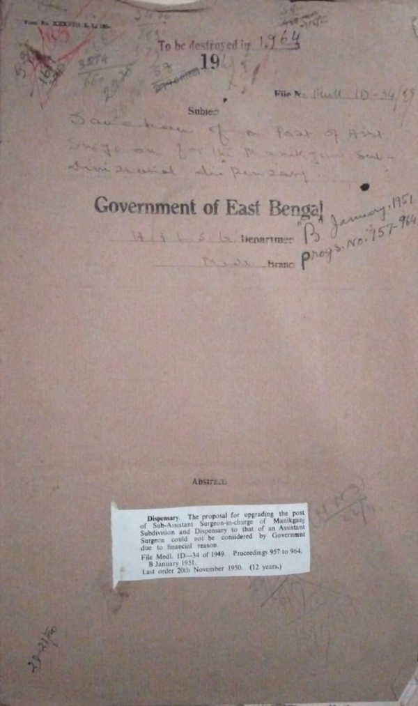 | Rack No. 09, Bundle No. 105, SI No. 8477 Realization of pensioner charges from the provinces of Indian Dominion. | Rack No. 09, Bundle No. 105, SI No. 8478 Release of recovered criminal lunatic Moktar Ali Howladar. | Rack No. 09, Bundle No. 105, SI No. 8479 Award of Prizes to the students of govt. Tibbiya College, Sylhet. | Rack No. 09, Bundle No. 105, SI No. 8480 Section of a post of Assistant Surgeon for the Manikganj Sub-Divisional Dispensary. | Rack No. 09, Bundle No. 105, SI No. 8481 Case against Kazi Abdul Mazid Head Clerk, civil Surgeon office, Kushtia for taking illegal gratification. | Rack No. 09, Bundle No. 105, SI No. 8482 Grant of Sea-Passage to the family of Dr. E.V. Novak, Prof. of Clinical Surgeon Medical College, Dacca. | Rack No. 09, Bundle No. 105, SI No. 8483 Retention of 3 posts Sub-Assistant Surgeons S.K. Hospital and Chittagong general Hospital. |