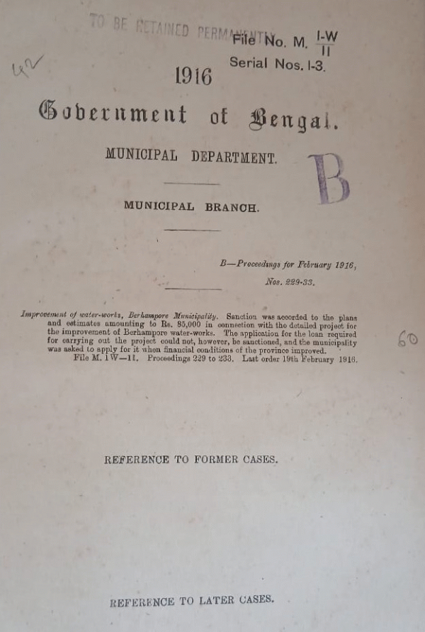 | Rack No. 12, Bundle No. 01 Sl No. 57 Appointment of Mr. Hingston, Deputy Valuer to act as Chief Valuer of the Calcutta Improvement trust during the absence of Mr. Shrosbree, on leave. | Rack No. 12, Bundle No. 01 Sl No. 58 Uttarpara water works Joan. | Rack No. 12, Bundle No. 01 Sl No. 59 Scheme for the improvement of the Chandpur water-works | Rack No. 12, Bundle No. 01 Sl No. 60 Improvement of water works Berhampore Municipality. | Rack No. 12, Bundle No. 01 Sl No. 61 Improvement of Sanitation of the town of Bankura. | Rack No. 12, Bundle No. 01 Sl No. 62 Improvement of Sanitation of the town of Bankura. | Rack No. 12, Bundle No. 01 Sl No. 63 Reconstitution of the Hooghly Chinsura Municipality. |
